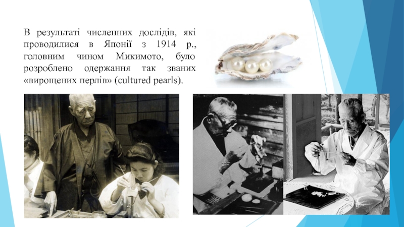 головним чином Микимото, було розроблено одержання так званих «вирощених перлів» (cultured pearls).