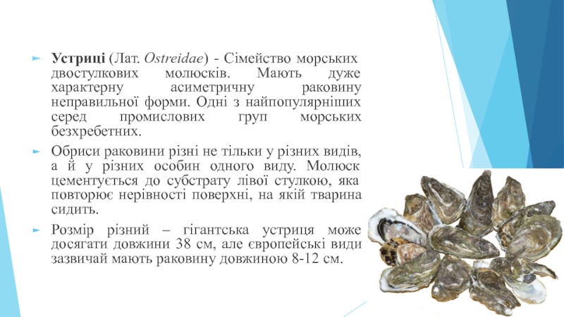 Слайд 2Устриці (Лат. Ostreidae) - Сімейство морських двостулкових молюсків. Мають дуже характерну асиметричну раковину