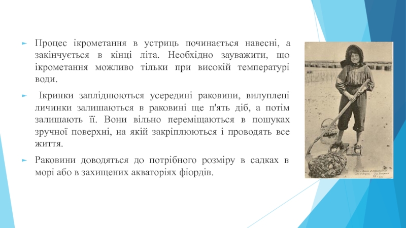 Слайд 22Процес ікрометання в устриць починається навесні, а закінчується в кінці літа.