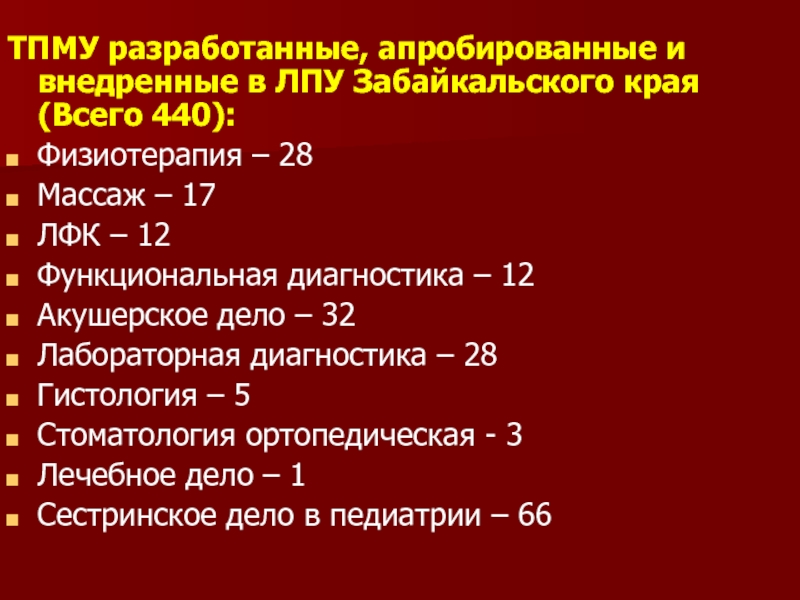 Слайд 28ТПМУ разработанные, апробированные и внедренные в ЛПУ Забайкальского края (Всего 440):