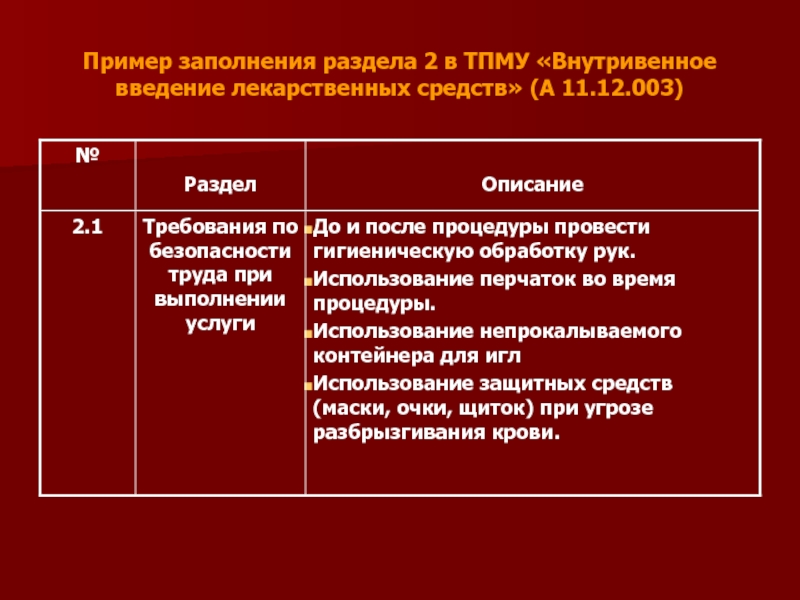 Слайд 16Пример заполнения раздела 2 в ТПМУ «Внутривенное введение лекарственных средств» (А