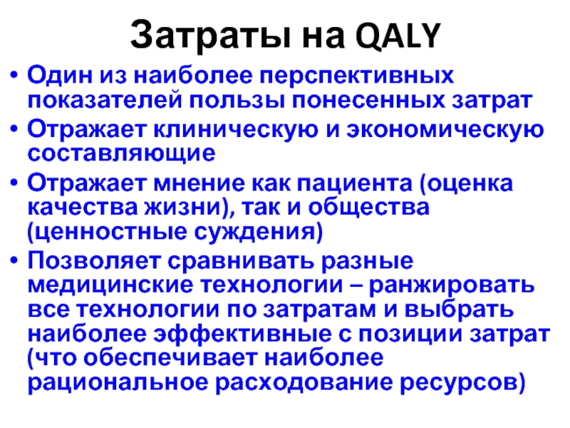 Позволяет сравнивать разные медицинские технологии – ранжировать все технологии по затратам и выбрать наиболее эффективные с позиции затрат (что обеспечивает наиболее рациональное расходование ресурсов)