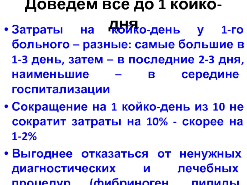 Сокращение на 1 койко-день из 10 не сократит затраты на 10% - скорее на 1-2%