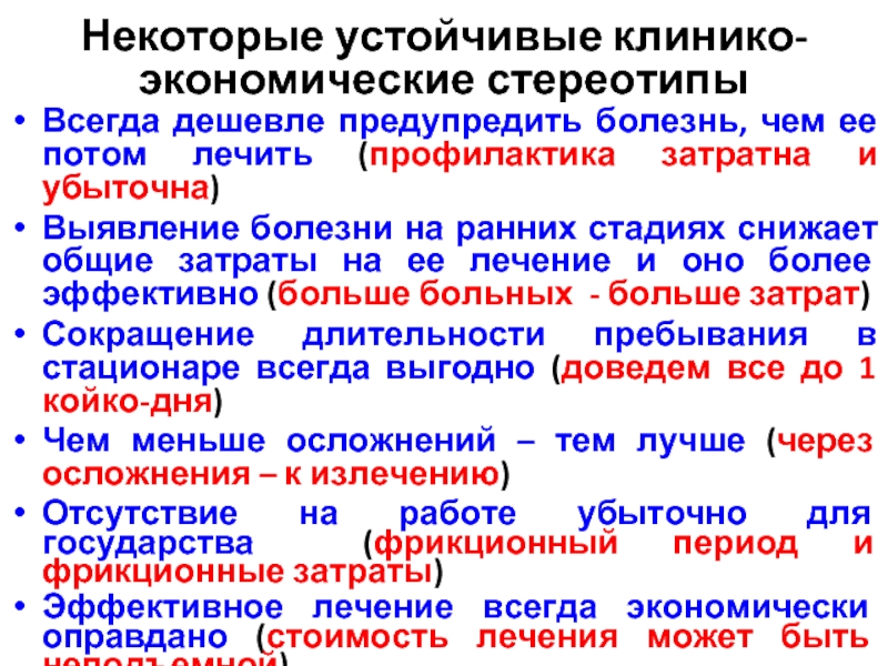 Слайд 10Некоторые устойчивые клинико-экономические стереотипы