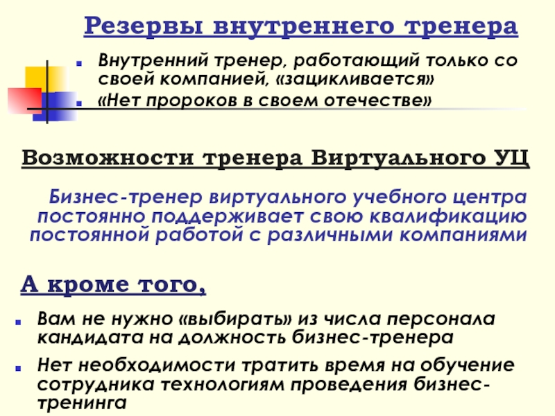 Нет необходимости тратить время на обучение сотрудника технологиям проведения бизнес-тренинга