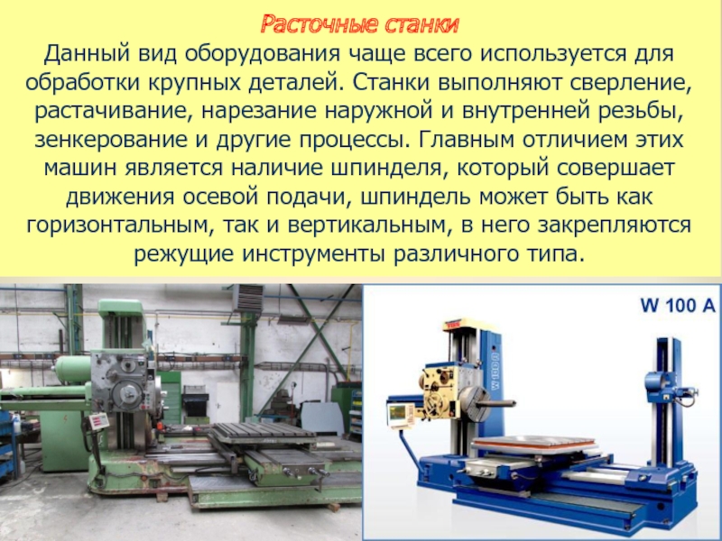 Станки выполняют сверление, растачивание, нарезание наружной и внутренней резьбы, зенкерование и другие процессы. Главным отличием этих машин является наличие шпинделя, который совершает движения осевой подачи, шпиндель может быть как горизонтальным, так и вертикальным, в него закрепляются режущие инструменты различного типа.