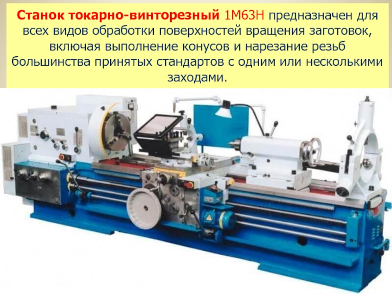 Слайд 7Станок токарно-винторезный 1М63Н предназначен для всех видов обработки поверхностей вращения заготовок,