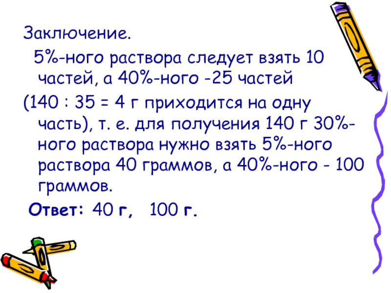 (140 : 35 = 4 г приходится на одну часть), т. е. для получения 140 г 30%-ного раствора нужно взять 5%-ного раствора 40 граммов, а 40%-ного - 100 граммов.