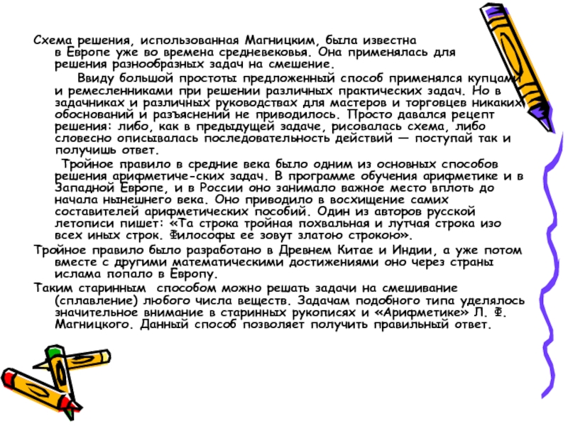 Таким старинным способом можно решать задачи на смешивание (сплавление) любого числа веществ. Задачам подобного типа уделялось значительное внимание в старинных рукописях и «Арифметике» Л. Ф. Магницкого. Данный способ позволяет получить правильный ответ.