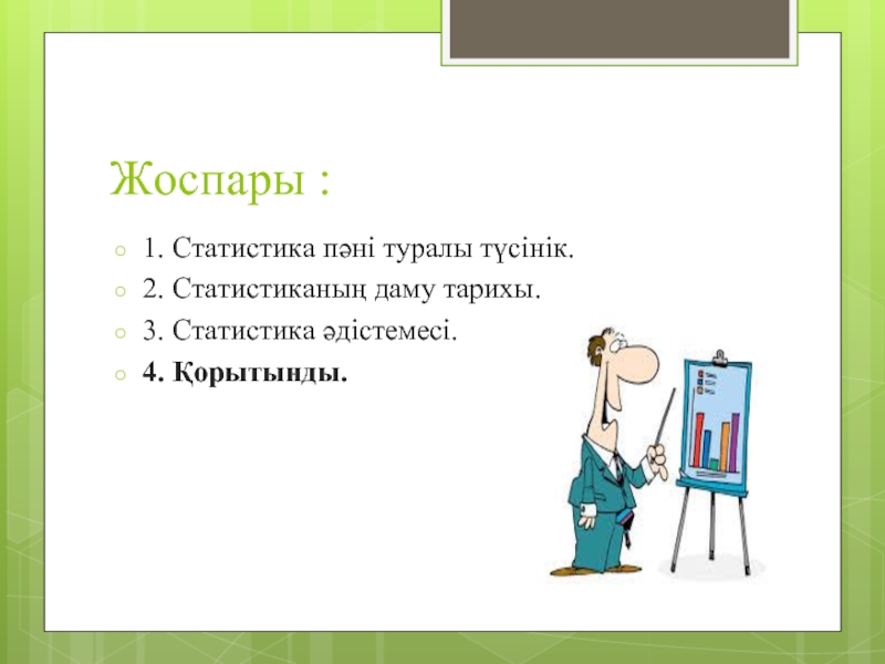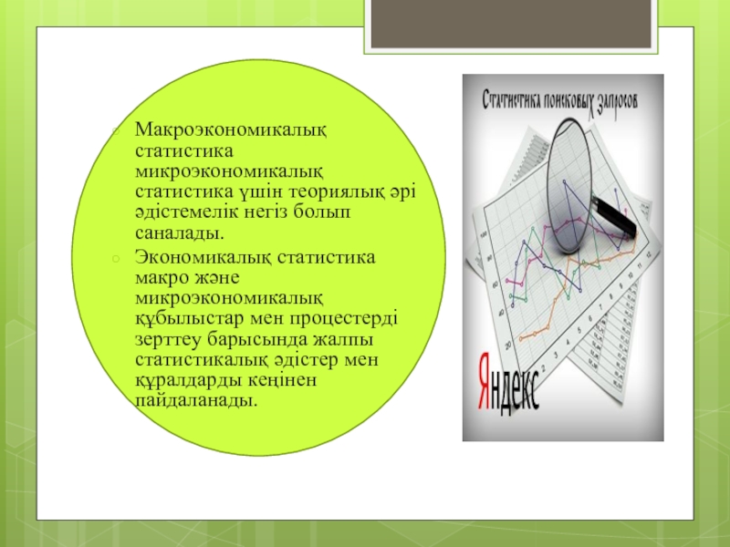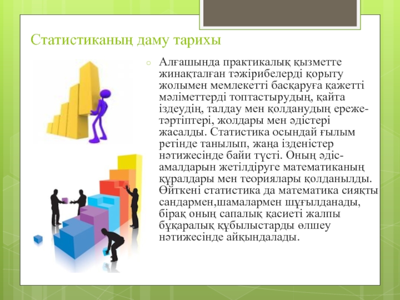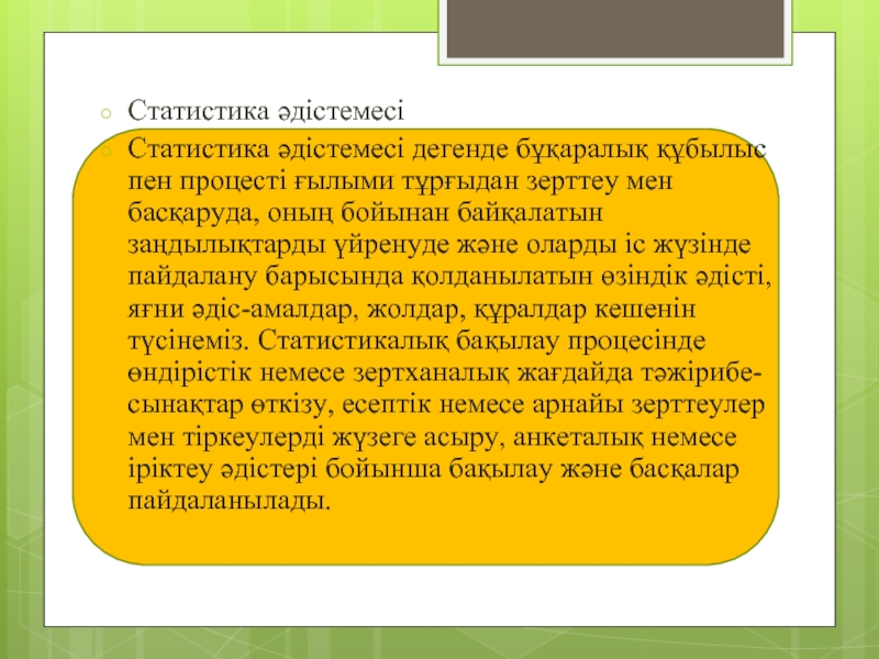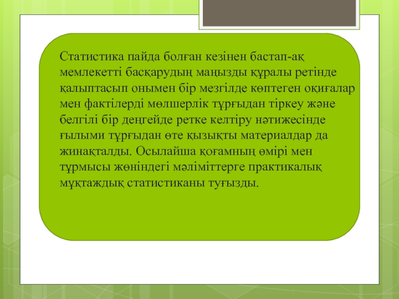 қоғам өмірінің сандық заңдылықтарын олардың сапалық сипаттайтын статистикалық ақпаратты жинап, өңдеуді, талдау мен жариялауды қамтитын практика саласы;