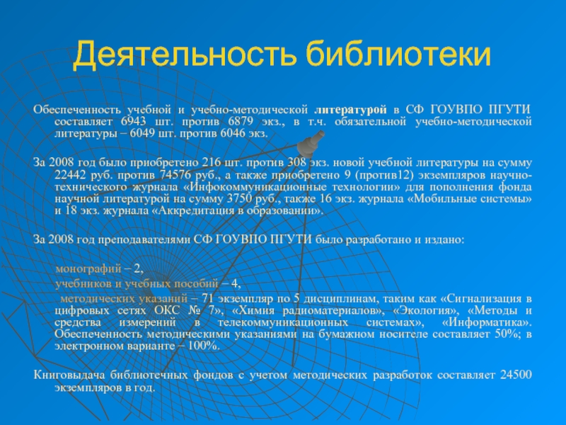 За 2008 год было приобретено 216 шт. против 308 экз. новой учебной литературы на сумму 22442 руб. против 74576 руб., а также приобретено 9 (против12) экземпляров научно-технического журнала «Инфокоммуникационные технологии» для пополнения фонда научной литературой на сумму 3750 руб., также 16 экз. журнала «Мобильные системы» и 18 экз. журнала «Аккредитация в образовании».