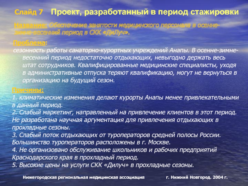 сезонность работы санаторно-курортных учреждений Анапы. В осенне-зимне-весенний период недостаточно отдыхающих, невыгодно держать весь штат сотрудников. Квалифицированные медицинские специалисты, уходя в административные отпуска теряют квалификацию, могут не вернуться в организацию на будущий сезон.