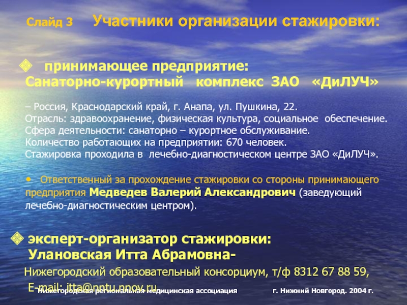 Цель направляющего предприятия: наладить деловые контакты с принимающим предприятием, изучить организацию оздоровительных услуг (в частности – методами эндоэкологической медицины) в ЗАО «ДиЛуч».