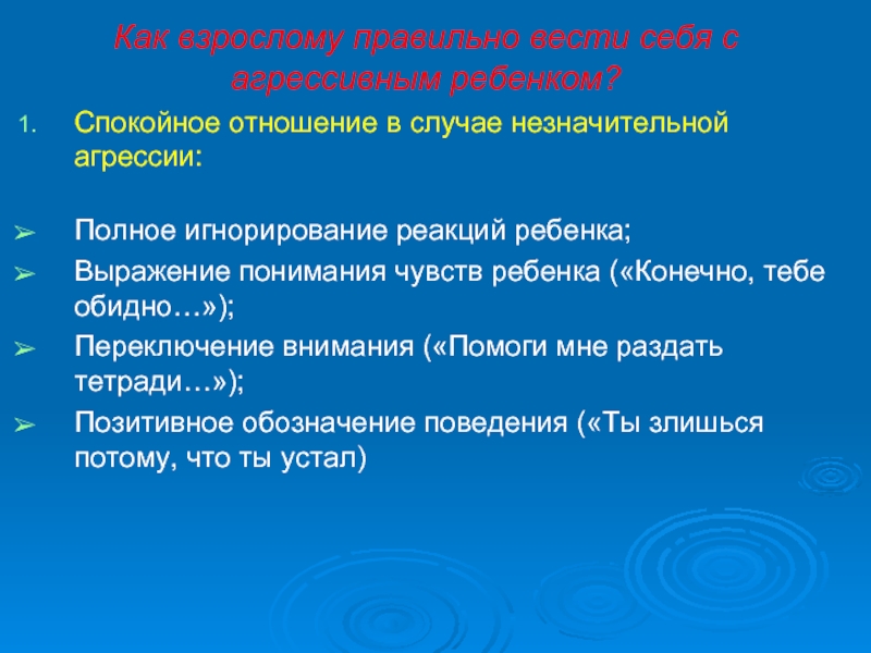 Слайд 15Как взрослому правильно вести себя с агрессивным ребенком?