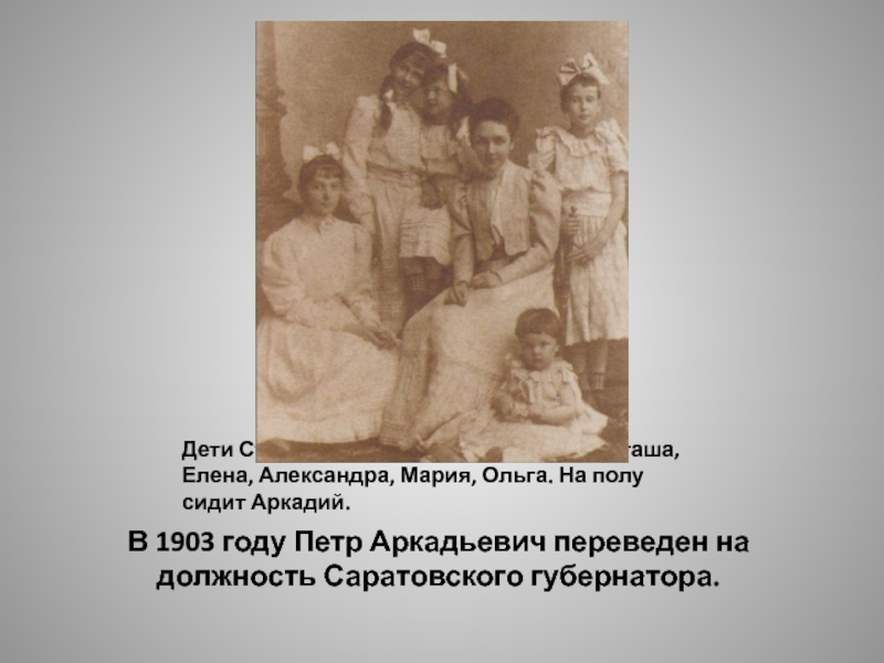 В 1903 году Петр Аркадьевич переведен на должность Саратовского губернатора.