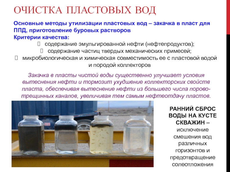 Закачка в пласты чистой воды существенно улучшает условия вытеснения нефти и тормозит ухудшение коллекторских свойств пласта, обеспечивая вытеснение нефти из большего числа порово-трещинных каналов, увеличивая тем самым нефтеотдачу пластов.