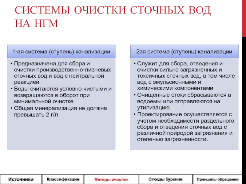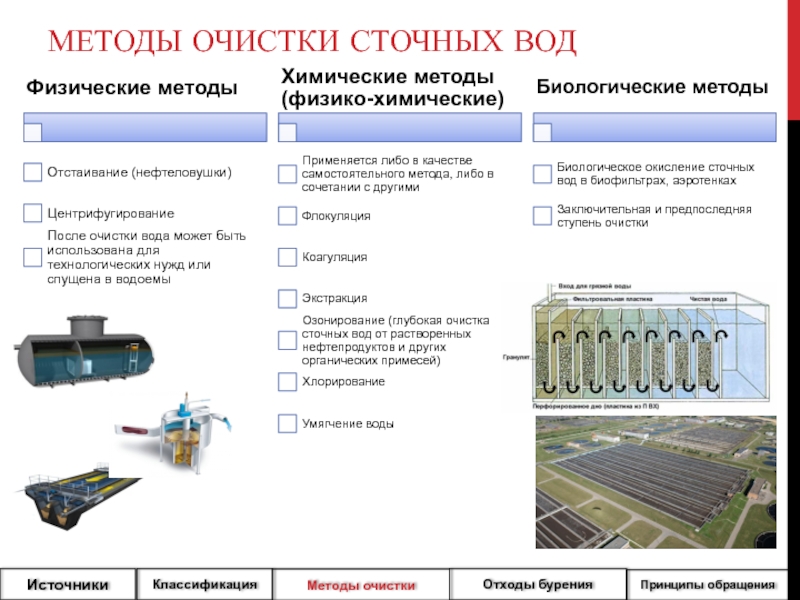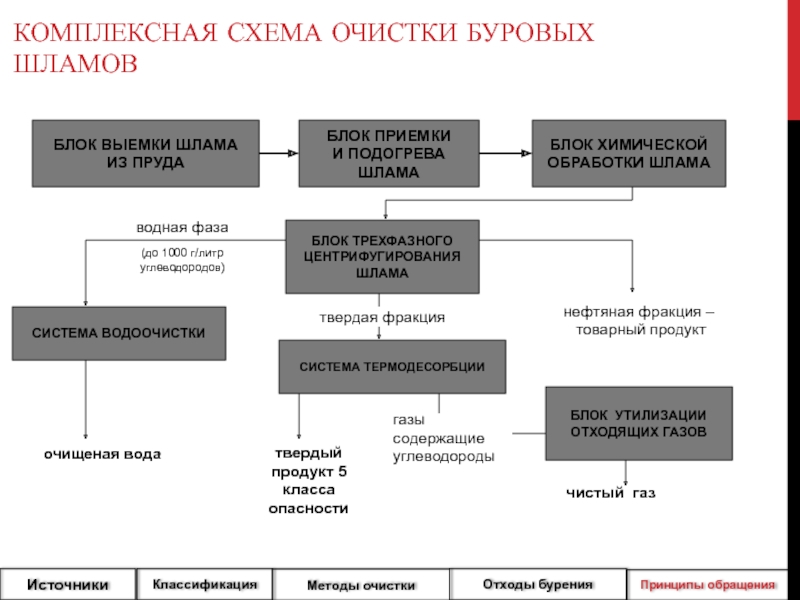 Действие систем очистки основывается на коагуляции и флокуляции дисперсных частиц и действии центробежной силы, создаваемой центрифугами для отделения полученных фрагментов (флокуляционно-сепарационная система).