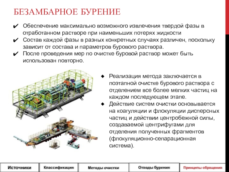 Реализация метода заключается в поэтапной очистке бурового раствора с отделением все более мелких частиц на каждом последующем этапе.