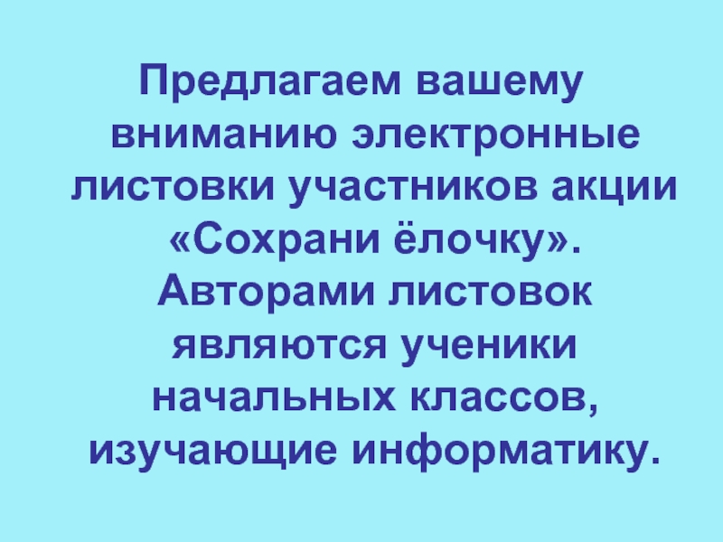 Слайд 2Предлагаем вашему вниманию электронные листовки участников акции «Сохрани ёлочку». Авторами листовок
