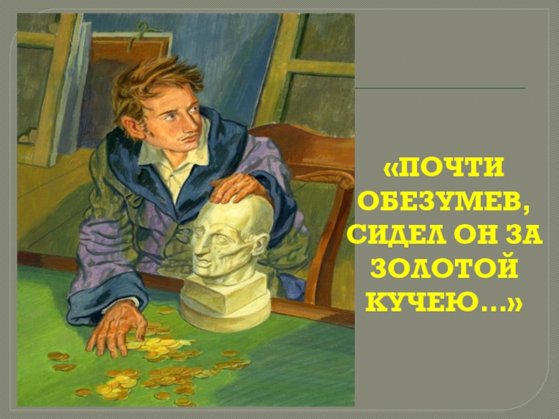 Слайд 5«ПОЧТИ ОБЕЗУМЕВ, СИДЕЛ ОН ЗА ЗОЛОТОЙ КУЧЕЮ…»
