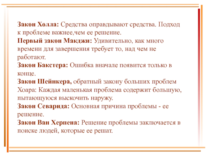 Слайд 76Закон Холла: Средства оправдывают средства. Подход к проблеме важнее,чем ее решение.