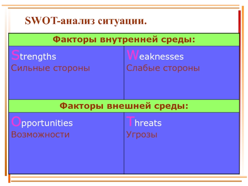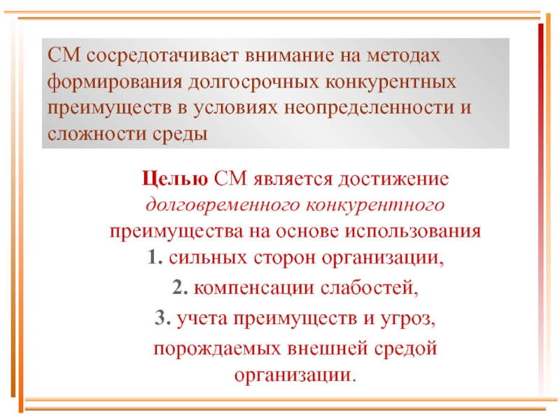 Целью СМ является достижение долговременного конкурентного преимущества на основе использования 1. сильных сторон организации,