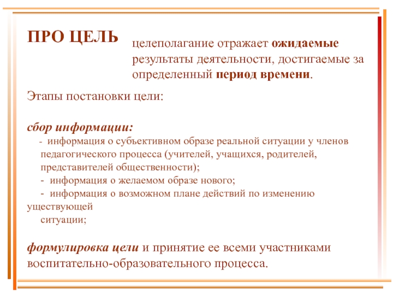Слайд 17целеполагание отражает ожидаемые результаты деятельности, достигаемые за определенный период времени.