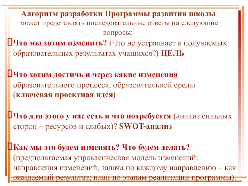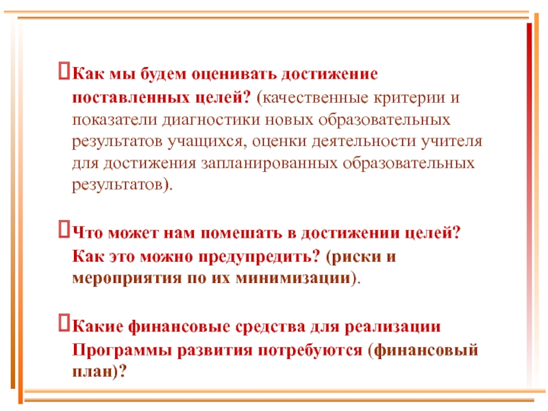 Пример (-) «Цель нашей программы — создание условий для разностороннего развития личности ученика...»