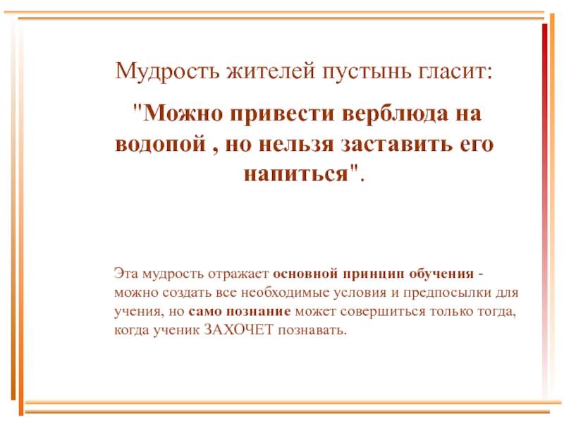 Эта мудрость отражает основной принцип обучения - можно создать все необходимые условия и предпосылки для учения, но само познание может совершиться только тогда, когда ученик ЗАХОЧЕТ познавать.