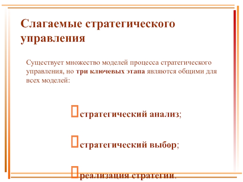 Акцентирует внимание на последовательности действий для осуществления стратегического управления.