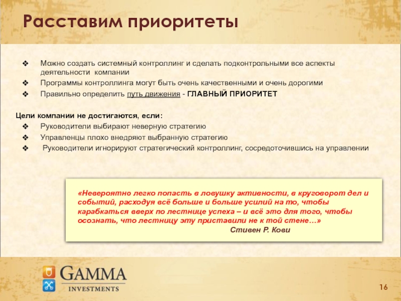 «Невероятно легко попасть в ловушку активности, в круговорот дел и событий, расходуя всё больше и больше усилий на то, чтобы карабкаться вверх по лестнице успеха – и всё это для того, чтобы осознать, что лестницу эту приставили не к той стене…»