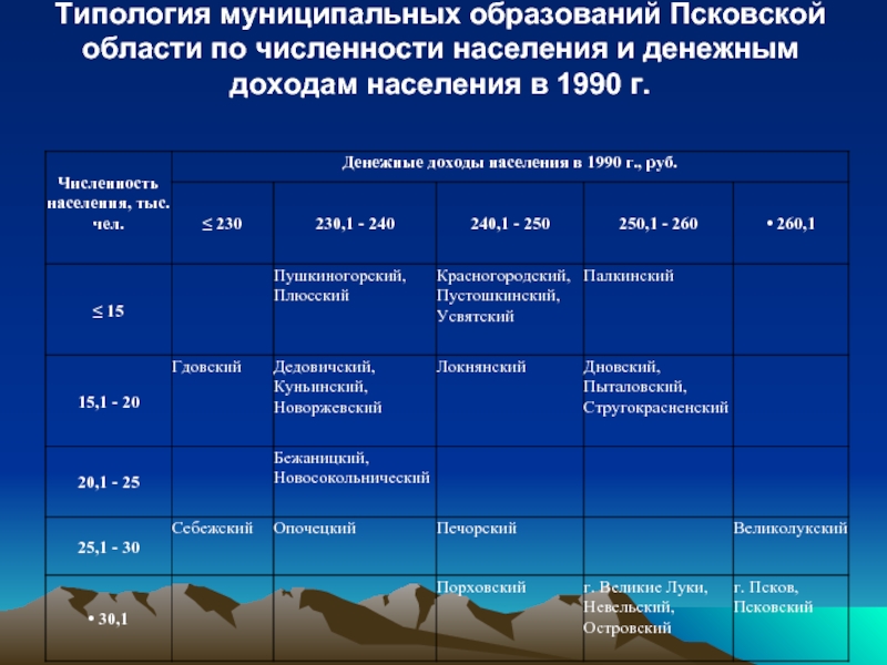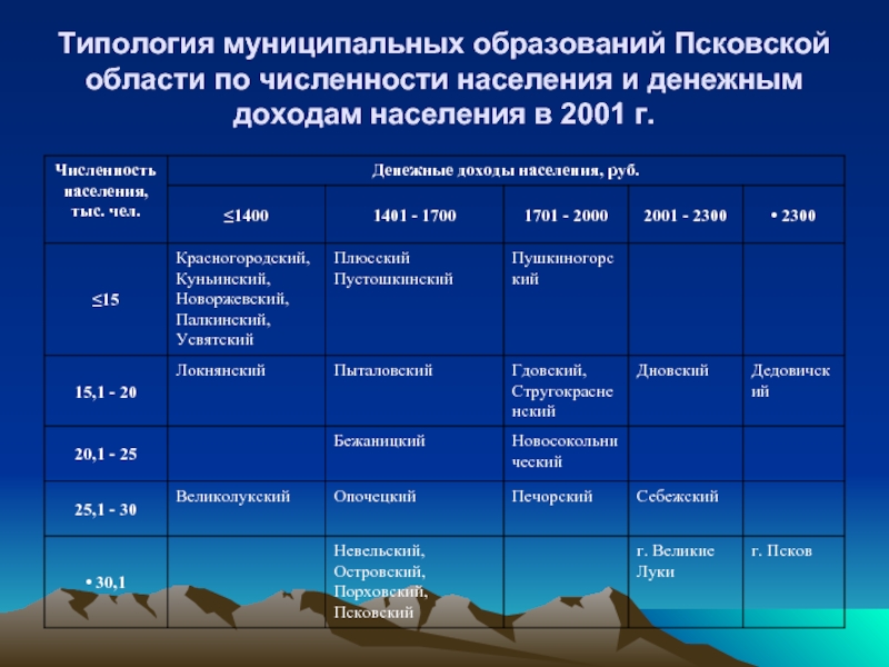 Слайд 8Типология муниципальных образований Псковской области по численности населения и денежным доходам