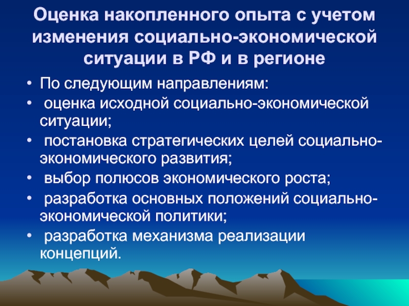 Слайд 13Оценка накопленного опыта с учетом изменения социально-экономической ситуации в РФ и