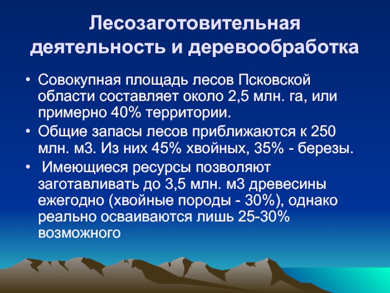 Имеющиеся ресурсы позволяют заготавливать до 3,5 млн. м3 древесины ежегодно (хвойные породы - 30%), однако реально осваиваются лишь 25-30% возможного