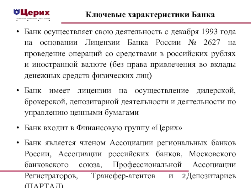 Наличие представительства ИК«Церих Кэпитал Менеджмент»
