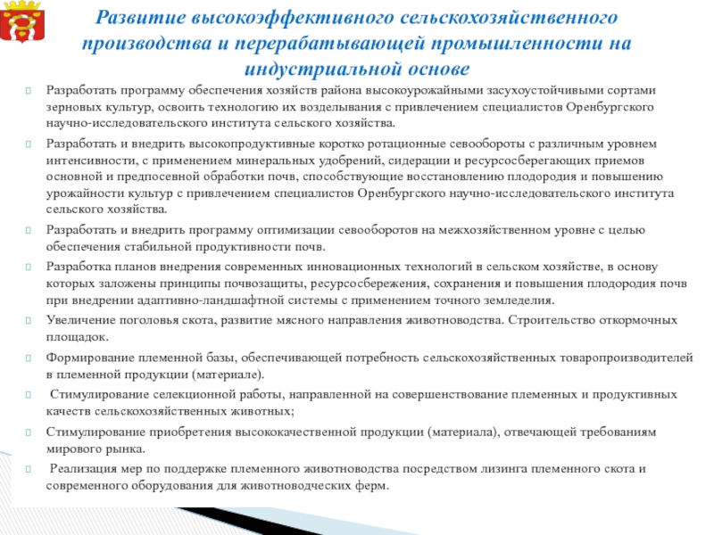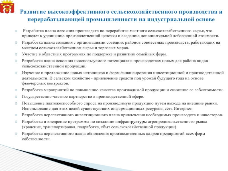 Развитие высокоэффективного сельскохозяйственного производства и перерабатывающей промышленности на индустриальной основе