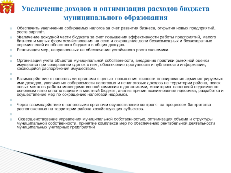Увеличение доходов и оптимизация расходов бюджета муниципального образования