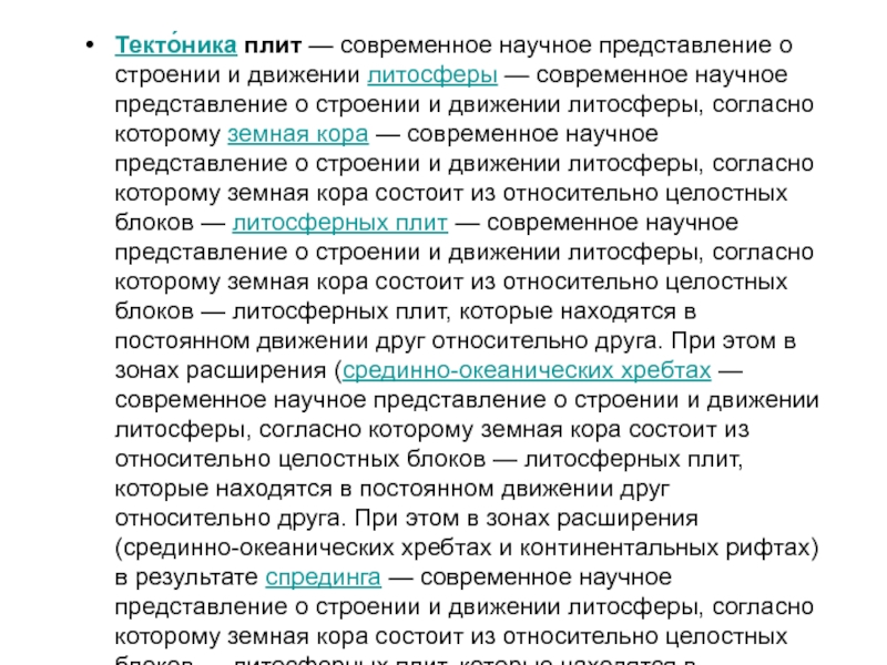 научное представление о строении и движении литосферы, согласно которому земная кора — современное научное представление о строении и движении литосферы, согласно которому земная кора состоит из относительно целостных блоков — литосферных плит — современное научное представление о строении и движении литосферы, согласно которому земная кора состоит из относительно целостных блоков — литосферных плит, которые находятся в постоянном движении друг относительно друга. При этом в зонах расширения (срединно-океанических хребтах — современное научное представление о строении и движении литосферы, согласно которому земная кора состоит из относительно целостных блоков — литосферных плит, которые находятся в постоянном движении друг относительно друга. При этом в зонах расширения (срединно-океанических хребтах и континентальных рифтах) в результате спрединга — современное научное представление о строении и движении литосферы, согласно которому земная кора состоит из относительно целостных блоков — литосферных плит, которые находятся в постоянном движении друг относительно друга. При этом в зонах расширения (срединно-океанических хребтах и континентальных рифтах) в результате спрединга (англ. seafloor spreading — растекание морского дна) образуется новая океаническая кора — растекание морского дна) образуется новая океаническая кора, а старая поглощается в зонах субдукции — растекание морского дна) образуется новая океаническая кора, а старая поглощается в зонах субдукции. Теория тектоники плит объясняет возникновение землетрясений — растекание морского дна) образуется новая океаническая кора, а старая поглощается в зонах субдукции. Теория тектоники плит объясняет возникновение землетрясений, вулканическую — растекание морского дна) образуется новая океаническая кора, а старая поглощается в зонах субдукции. Теория тектоники плит объясняет возникновение землетрясений, вулканическую деятельность и процессы горообразования, по большей части приуроченные к границам плит.