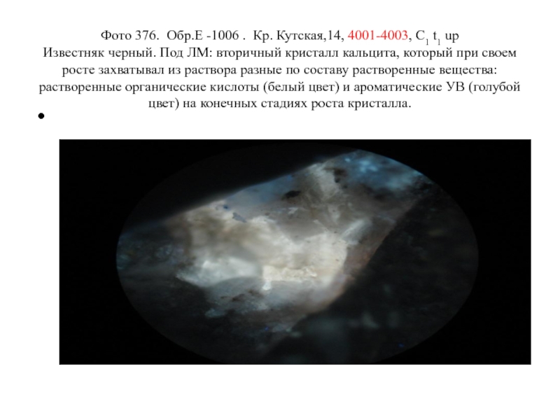 черный. Под ЛМ: вторичный кристалл кальцита, который при своем росте захватывал из раствора разные по составу растворенные вещества: растворенные органические кислоты (белый цвет) и ароматические УВ (голубой цвет) на конечных стадиях роста кристалла.