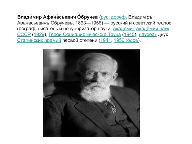 Слайд 21Влади́мир Афана́сьевич О́бручев (рус. дореф. Владиміръ Аѳанасьевичъ Обручевъ, 1863—1956) — русский и
