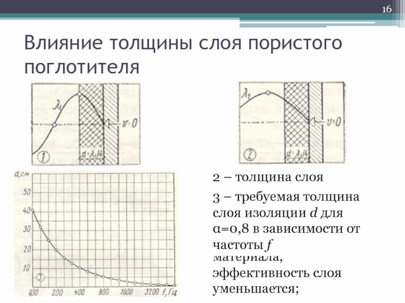 d=λ1/4 : максимум скорости звуковых волн длиной λ2 расположен вне слоя пористого материала, эффективность слоя уменьшается;