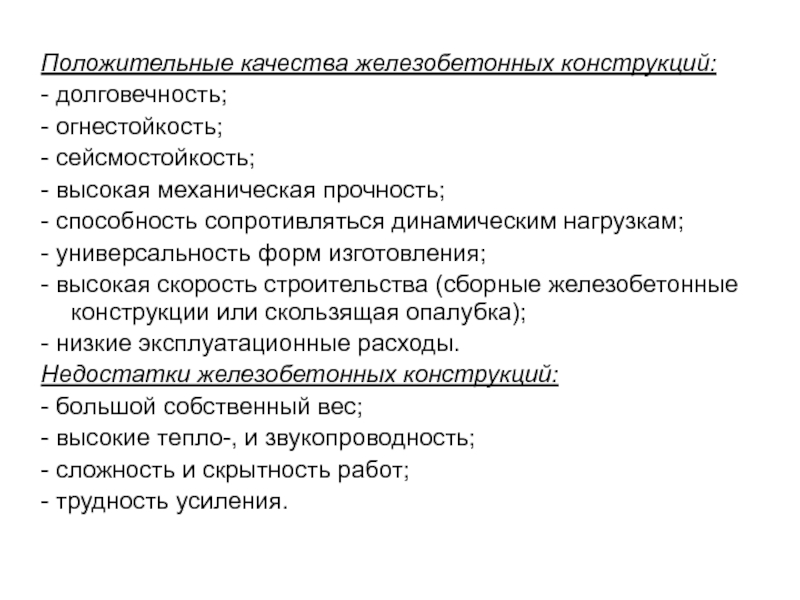 Конструкции должны обладать необходимой прочностью, жесткостью, устойчивостью, надежностью, выносливостью, долговечностью. Кроме того, они должны быть индустриальны, технологичны, в меру трудоемки в изготовлении, обладать достаточной огнестойкостью, коррозионностойкостью и т.п.