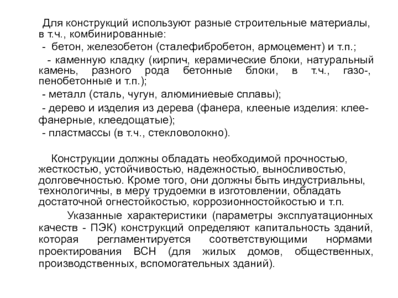 Указанные характеристики (параметры эксплуатационных качеств - ПЭК) конструкций определяют капитальность зданий, которая регламентируется соответствующими нормами проектирования ВСН (для жилых домов, общественных, производственных, вспомогательных зданий).