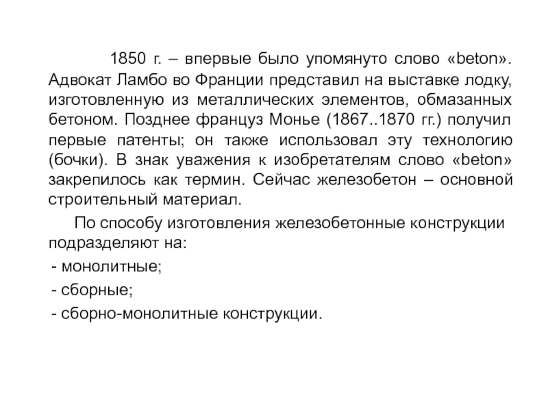 слово «beton». Адвокат Ламбо во Франции представил на выставке лодку, изготовленную из металлических элементов, обмазанных бетоном. Позднее француз Монье (1867..1870 гг.) получил первые патенты; он также использовал эту технологию (бочки). В знак уважения к изобретателям слово «beton» закрепилось как термин. Сейчас железобетон – основной строительный материал.