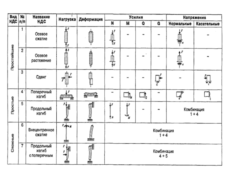 Конструкции могут работать на изгиб, растяжение, сжатие, кручение, срез, скалывание и т.п., испытывать сложное напряженное состояние.