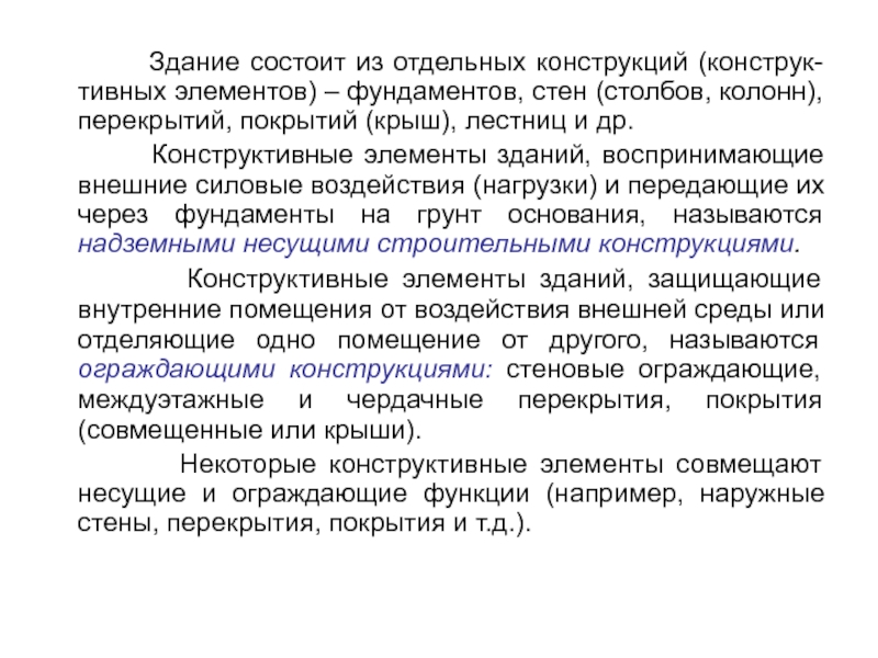 Некоторые конструктивные элементы совмещают несущие и ограждающие функции (например, наружные стены, перекрытия, покрытия и т.д.).