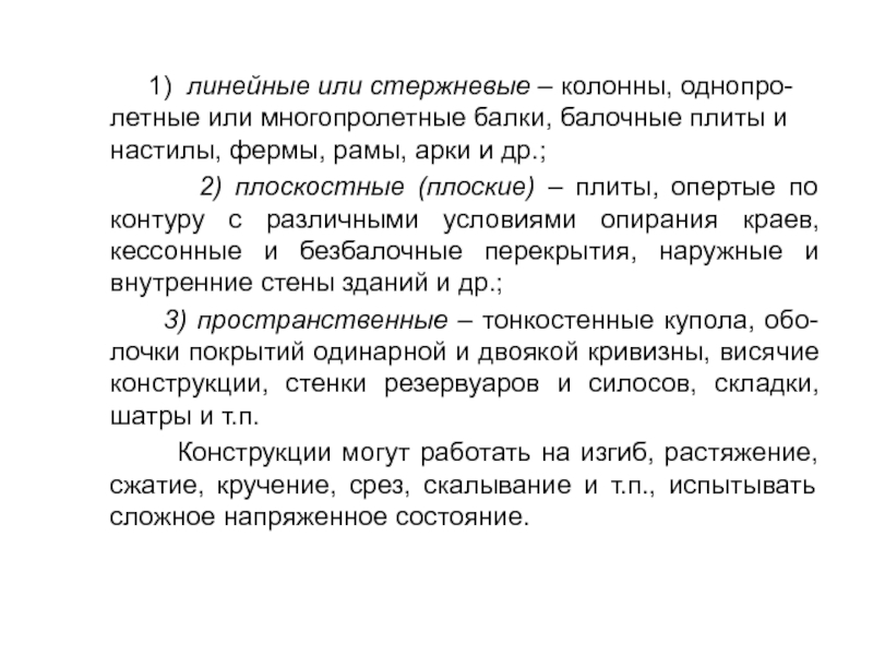 – колонны, однопро- летные или многопролетные балки, балочные плиты и настилы, фермы, рамы, арки и др.;