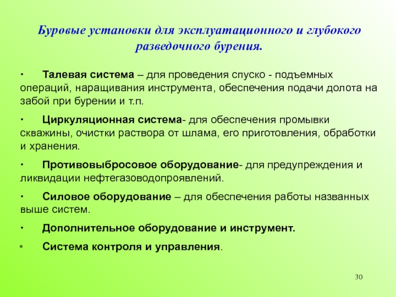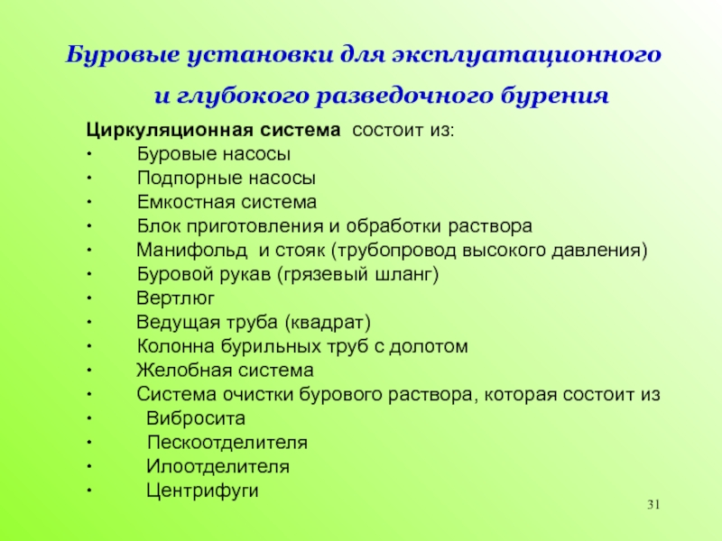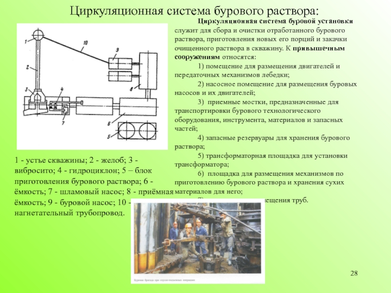 Циркуляционная система буровой установки служит для сбора и очистки отработанного бурового раствора, приготовления новых его порций и закачки очищенного раствора в скважину. К привышечным сооружениям относятся: