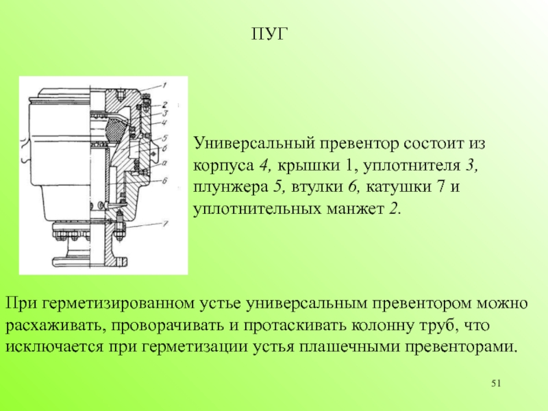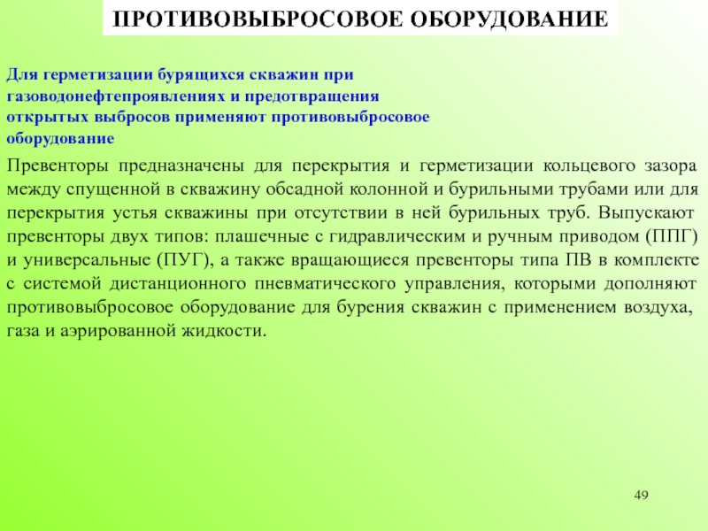 Превенторы предназначены для перекрытия и герметизации кольцевого зазора между спущенной в скважину обсадной колонной и бурильными трубами или для перекрытия устья скважины при отсутствии в ней бурильных труб. Выпускают превенторы двух типов: плашечные с гидравлическим и ручным приводом (ППГ) и универсальные (ПУГ), а также вращающиеся превенторы типа ПВ в комплекте с системой дистанционного пневматического управления, которыми дополняют противовыбросовое оборудование для бурения скважин с применением воздуха, газа и аэрированной жидкости.