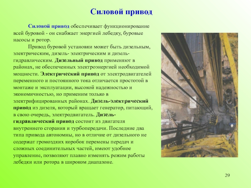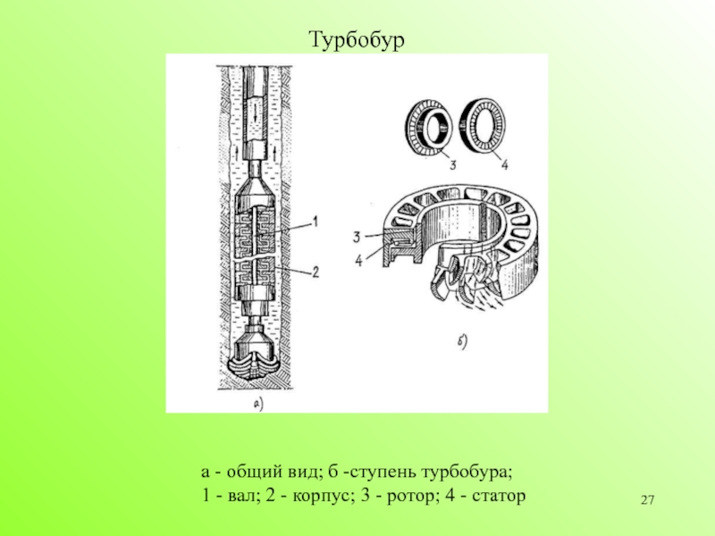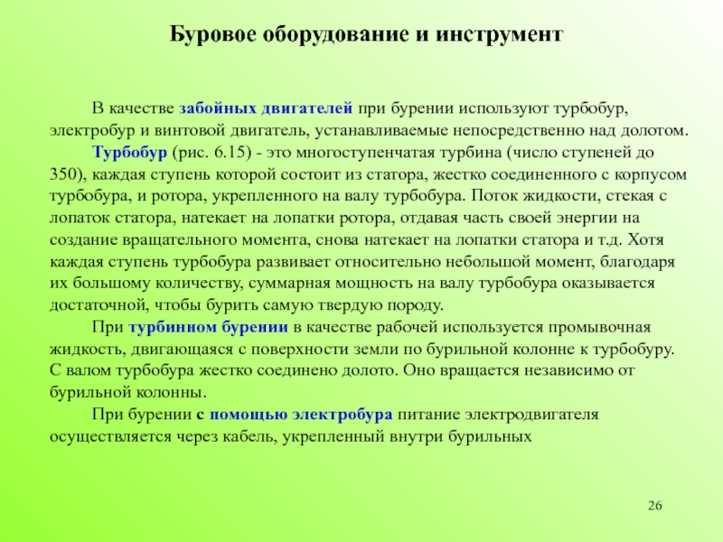 Турбобур - это гидравлическая турбина, приводимая во вращение с помощью нагнетаемой в скважину промывочной жидкости. Электробур представляет собой электродвигатель, защищенный от проникновения жидкости, питание к которому подается по кабелю с поверхности. Винтовой двигатель - это разновидность забойной гидравлической машины, в которой для преобразования энергии потока промывочной жидкости в механическую энергию вращательного движения использован винтовой механизм.